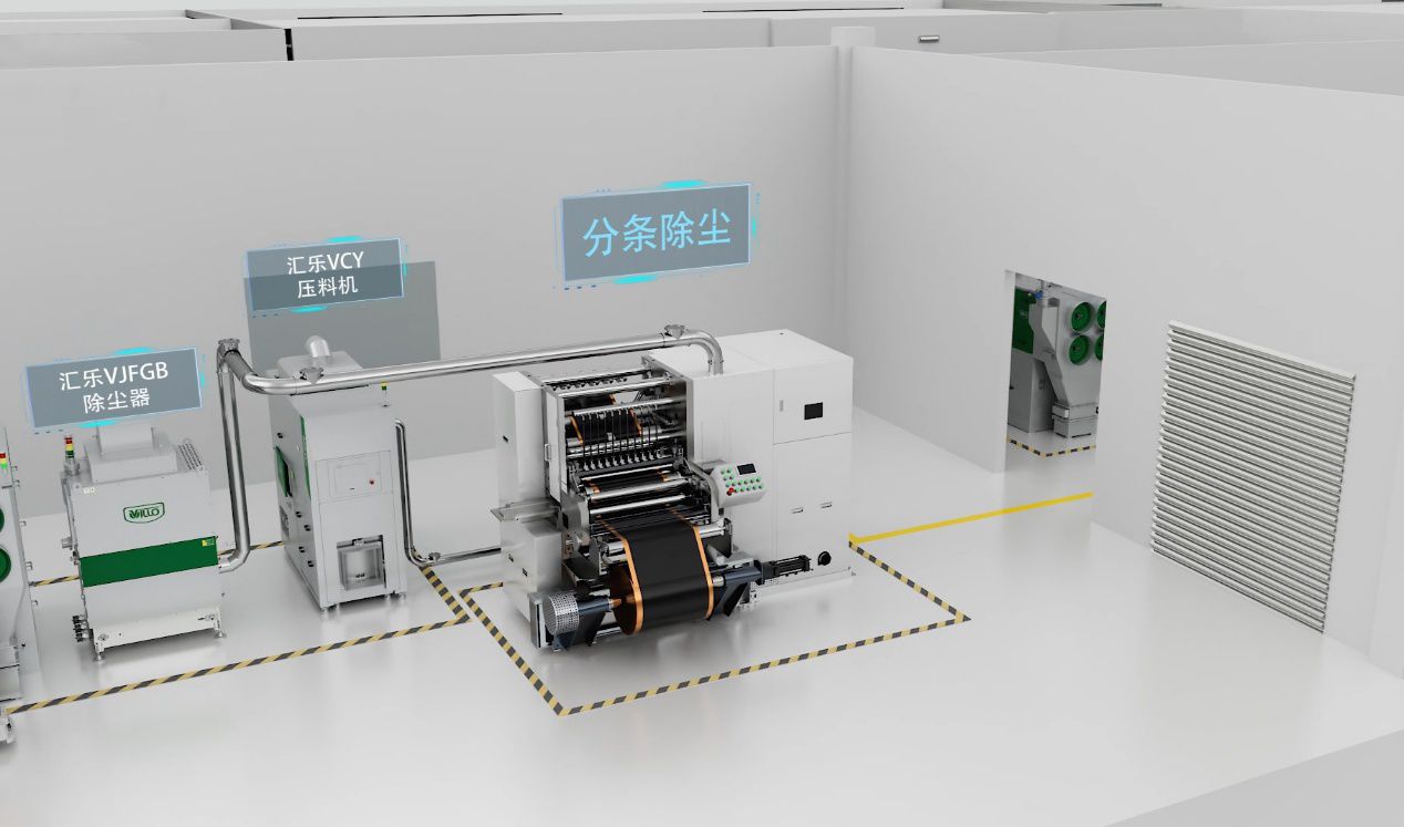 經涂布、輥壓后的整卷極片材料,需要分切成定寬的尺寸。在使用分條機進行分切的過程中,會附帶產生很多多余的粉末,這些粉末會遺留在分條機上,影響設備的使用壽命。針對此類工況,可選用我司VJGFB系列除塵器。