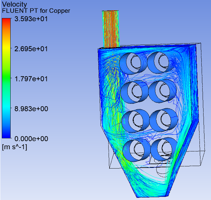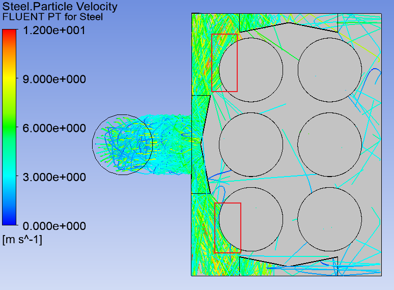針對>100um粒徑的顆粒,對其進行顆粒軌跡分析,由圖2.4可知,大顆粒1號和3號濾筒附近的表面顆粒速度在6~9m/s,對濾筒沖擊較大,線條密集代表此處的顆粒較多,從圖2.5顆粒分布圖模擬圖也佐證了這一點。